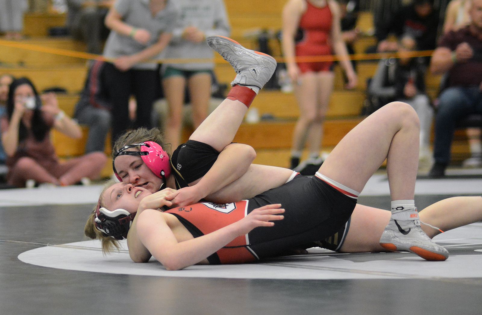 Evergreen's Margaret Burrier (top) gets back points on Chatfield's Alyssa Cyrus during the 140-pound final at the Jeffco League Championships on Thursday, Feb. 5, at Conifer High School. Burrier took a 17-4 major decision over Cyrus.